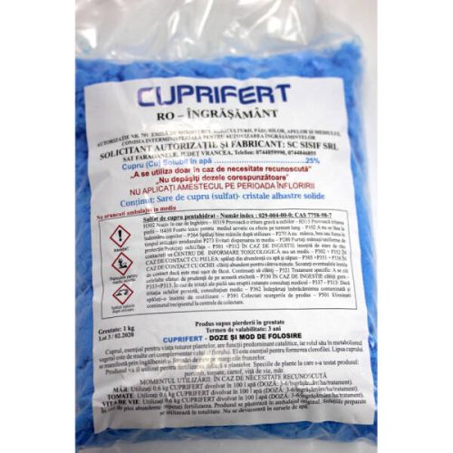 Sulfatul de Cupru se poate utiliza ca materie prima la fabricarea altor produse cum sunt zeama bordeleza, sulfatul de cupru tribazic, hidroxidul de cupru, substante care sunt autorizate pentru utilizare in protectia plantelor pe teritoriul Romaniei si este utilizat in agricultura si in viticultura in Austria, Polonia, Germania, Franta etc. Sulfatul de cupru sau piatra vanata, se foloseste la stropirea legumelor, pomilor fructiferi, vitei de vie, impotriva manei. Combaterea manei se face prin stropiri repetate (saptamanal) cu o solutie (zeama bordeleza) la o concentratie de: 0.75-1% sulfat de cupru si 0,5-0,75% var nestins sau 1-1,5% var stins pasta. Sulfatul de cupru (piatra vanata) se dizolva separat in apa calda, apoi se amesteca cu solutia de var si se completeaza cu restul de apa. Solutia preparata se foloseste in maxim 12 ore. -A se utiliza numai in caz de necesitate recunoscuta; -Nu depasiti dozele corespunzatoare; -Nociv in caz de inghitire; -Provoaca o iritare grava a ochilor; -Provoaca iritarea pielii; -Foarte toxic pentru mediul acvatic cu efecte pe termen lung; -Spalati bine mainile dupa utilizare; -A nu se lasa la indemana copiilor. Produsul poate fi utilizat pentru fertilizarea foliara a plantelor. Momentul utilizarii : in caz de necesitate recunoscuta. Mar: Utilizati 0,6 kg Cuprifert dizolvat in 100 l apa. In caz de ploi abundente repetati fertilizarea. Tomate: Utilizati 0,6 kg Cuprifert dizolvat in 100 l apa. In caz de ploi abundente, repetati fertilizarea. Vita de vie: Utilizati 0,6 kg Cuprifert dizolvat in 100 l apa. In caz de ploi abundente, repetati fertilizarea.