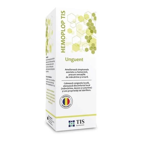 Unguent antihemoroidal Hemoplop, 50 ml, Tis Farmaceutic Proprietati: - lubrifiant, hidratant, protector; - calmeaza congestia locala si atenueaza disconfortul local (inlatura senzatiile de mancarime, durere, usturime); - accelereaza procesul de reepitelizare favorizand refacerea mucoasei. Indicatii: - in tratamentul afectiunilor mucoasei anale (perianale) - hemoroizi interni si externi, fisuri si fistule anale; - dupa interventii chirurgicale proctologice; - pentru ameliorarea starii generale a mucoasei anale fragile si deshidratate, la persoanele varstnice sau imobilizate la pat. Ingrediente: Extract lichid de propolis, extract lichid de patlagina, extract lichid din muguri de plop, extract de coada soricelului, rezorcina, alcool cetilic, ceara de albine, ulei de parafina, monostearat de gliceril, glicerina, apa purificata, borax. Mod de administrare: Se aplica de 1-4 ori pe zi, in strat subtire, cu o usoara masare a zonei afectate, dupa toaleta locala prealabila. Prezentare: 50 ml Unguent antihemoroidal Hemoplop, 50 ml, Tis Farmaceutic Proprietati: - lubrifiant, hidratant, protector; - calmeaza congestia locala si atenueaza disconfortul local (inlatura senzatiile de mancarime, durere, usturime); - accelereaza procesul de reepitelizare favorizand refacerea mucoasei. Indicatii: - in tratamentul afectiunilor mucoasei anale (perianale) - hemoroizi interni si externi, fisuri si fistule anale; - dupa interventii chirurgicale proctologice; - pentru ameliorarea starii generale a mucoasei anale fragile si deshidratate, la persoanele varstnice sau imobilizate la pat. Ingrediente: Extract lichid de propolis, extract lichid de patlagina, extract lichid din muguri de plop, extract de coada soricelului, rezorcina, alcool cetilic, ceara de albine, ulei de parafina, monostearat de gliceril, glicerina, apa purificata, borax. Mod de administrare: Se aplica de 1-4 ori pe zi, in strat subtire, cu o usoara masare a zonei afectate, dupa toaleta locala prealabila. Prezentare: 50 ml