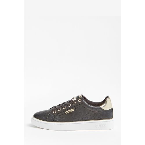 Caracteristici Culoare: negru - auriu deschis Varf: rotund Tip talpa: plata Detalii: aplicatii cu logo metalic Stil: casual Sistem inchidere: siret Compozitie Partea superioara: alte materiale Material interior: textil Material talpa: alte materiale