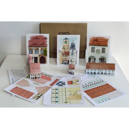 * 3 planse ale unor cladiri istorice, care pot fi decupate, indoite si lipite astfel incat sa se transforme in miniaturi 3D: Turnul Sfatului, Casa Artelor si Casa Haller.* 3 cartoline format A5, care cuprind detalii in prim-plan ale celor trei cladiri. Acestea pot fi folosite pe post de carti postale sau pot fi inramate pe post de tablouri. Rama foto este cu titlu de prezentare, nefiind inclusa in pachet.* 1 brosura informativa despre Sibiu si cele trei cladiri istorice in limbile romana, engleza, germana si maghiaraToate aceste materiale sunt ambalate intr-o cutie special creata si personalizata manual, cu stema orasului.Sibiu la cutie este un produs potrivit copiilor intre 9 – 99 de aniDe ce sa cumpar Sibiu la cutie?Este un cadou special pentru copiii pasionati de arhitectura, constructii, lucru manualDezvolta motricitatea, atentia, memoria, vocabularul, cultura generala si nu in ultimul rand increderea in sine.Stimuleaza discutiile despre oras si cladirile lui, despre cum ar trebui sa fie spatiul public, spatii verzi vs. spatii construite, despre accesibilitate, dimensiuni/arhitectura/ profesii etc.Este un cadou original, autentic si in editie limitata!Este desenat de cunoscutul ilustrator Dan Ungureanu (Apolodor, Fram ursul polar, Micul Print, etc.)Este un suvenir unic ce aduce, la propriu, o parte din centrul istoric al Sibiului la tine acasa.Poate fi trimis aproape oriunde in lumeEste un produs romanesc creat in patru limbi: romana, engleza, germana, maghiara.