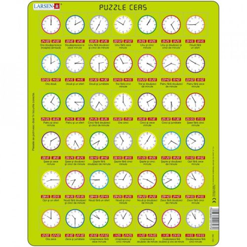 Puzzle Ceas Analogic are 42 de piese cu cate un ceas pe fiecare, toate aratand cate o ora diferita. Sub fiecare piesa este scrisa ora in cifre si cuvinte. Fiecare piesa se potriveste numai pe locul potrivit.Larsen este o firma norvegiana, care produce puzzle-uri, inca din 1953. Ideea de la care pornesc produsele lor este aceea de a oferi copiilor puzzle-uri educative, care sa ii distreze.. Puzzle-urile Larsen au o plansa cu margini permanente pentru a-i fi copilului mai usor sa se joace si pentru o depozitare usoara. Puzzle-urile sunt confectionate din carton gros. Acest lucru permite copilului sa apuce mai bine piesele si sa nu se rupa.