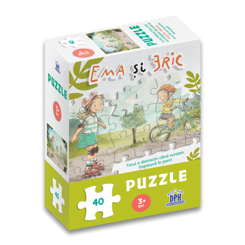 Ema si Eric – Puzzle este recomandat tuturor copiilor cu varsta peste 3 ani.Acest puzzle contine 40 de piese si ii face pe copii sa observe si sa invete cum sa construiasca imaginea personajelor preferate din seria Ema si Eric, cei doi Pofticiosi, micii eroi ai indragitelor carti scrise de Printesa Urbana.De la ultimele aventuri, Ema si Eric sunt foarte bine si au crescut. Astazi s-au decis sa iasa la plimbare in parc, Ema – cu rolele si Eric – cu bicicleta.Atunci cand o piesa se potriveste perfect cu o alta piesa, o noua lume prinde viata in mainile copiilor, iar acest lucru ii face pe cei mici sa fie din ce in ce mai entuziasmati cu fiecare puzzle realizat.Puzzle-ul creeaza abilitati de invatare si intelegere. Este modalitatea ideala de a-ti ajuta copilul sa inteleaga modul de rezolvare a problemelor simple, dezvoltand abilitati importante care il vor ajuta pe masura ce va progresa spre sarcini mai dificile.Constructia pieselor de carton face ca puzzle-ul sa fie usor de inteles si de utilizat si, de asemenea, este o modalitate excelenta de a imbunatati coordonarea maini-ochi si de a incuraja dezvoltarea abilitatilor motorii esentiale si de concentrare.DESPRE AUTORI:Ioana Chicet-Macoveiciuc este fost jurnalist, in prezent scriitor de carte si de blog si organizator de evenimente pentru parinti. Are peste 15 ani de experienta in presa scrisa, project management si comunicare on-line.In iunie 2016 a lansat prima carte pentru copii, Te iubesc, orice ai face, care a inregistrat peste 10 000 de exemplare vandute in primele doua luni. Au urmat titluri de succes, precum: Vacanta Pofticiosilor, Mami, e gata?, Impreuna, Craciunul perfect al Emei, Baietelul cu aripa de fluture, CuMinte de Craciun, Te rog, multumesc, te iubesc, Prima zi de scoala a Mirei, Cand ma fac mare, Jocul meseriilor – 26 de jetoane – Ema si Eric, Ema si Eric invata bunele maniere – puzzle gigant, plansa Meserii cu Ema si Eric, Coloram cu Ema si Eric, Ce, cum si de ce simt, Creeaza povesti cu Ema si Eric – Aventuri in oras, Coloram cu Ema si Eric, Ema spune pofta buna, Aventura Pofticiosilor, Activitati de Craciun cu Ema si Eric, Vraja ecranelor – Ema si Eric regasesc placul de joc, Labirinturi cu Ema si Eric, Eric merge la gradinita.Lavinia Trifan, ilustrator si autor al aventurilor micului Catel de Usturoi din cartea Poftiti la Bal si al jocului Poftiti la joaca!, citea o multime de povesti in copilarie, iar aventura sa ca autor a inceput devreme, in studentie. Este autor si ilustrator si al cartii de colorat In lumea fructelor si a legumelor cu Micul Catel de Usturoi.De asemenea, Lavinia Trifan a dat viata personajelor Ema si Eric din seria autoarei Ioana Chicet-Macoveiciuc.Caracteristici:Autor: Ioana Chicet-Macoveiciuc;Ilustratii: Lavinia Trifan;Varsta: 3 ani+;40 de piese de puzzle;1 plansa A3;Cutie cartonata (dimensiuni 11,5 x 16 cm).