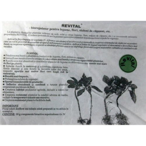 Revital este un bioregulator utilizat pentru legume, flori, stoloni de capsuni, etc. Revital stimuleaza prinderea la plantare a rasadurilor de flori, legume, stoloni de capsuni, fortifica culturile in timpul vegetatiei. Produsul REVITAL se prezinta sub forma unui praf ce se dizolva in apa. REVITAL se va dilua cu apa, 10g de praf la 10 litri de apa. Este compatibil cu majoritatea pesticidelor si fertilizantilor utilizati in agricultura, exceptie cele care conţin cupru. Se utilizeaza la plantarea rasadurilor de sera, solar si camp, cum ar fi: legume, flori, stoloni de capsuni etc.) se recomanda utilizarea preparatului Revital. El reduce perioada de stres la plantare permitand plantelor sa porneasca mai repede in vegetatie. Daca se va aplica in fazele timpurii de vegetatie (3-4 frunze adevarate), el accelereaza si intensifica cresterea sistemului de radacini secundare care au rol in procseul de absorbtie al apei si substantelor nutritive. La aplicarea foliara in timpul vegetatie el determina o dezvoltare mai buna cu cresterea vigurozitatii, respectiv a sanatatii plantei, ceea ce se rasfrange favorabil asupra aspectelor calitative si cantitative ale recoltei Avantaje: · Reduce perioada de stres la plantare; · Prindere mai buna a rasadurilor de legume, flori, stoloni de capsuni; · Dezvoltare mai viguroasa a tuturor plantelor; · Confera rezistenta mai buna la boli, daunatori, seceta, temperaturi scazute; · Cresterea numarului de flori pe planta; · Recolta mai timpurie; · Prelungirea ciclului de vegetatie; · Calitate superioara a recoltei; · Sporuri considerabile de productie; · Refacerea vegetatiei dupa grindina.