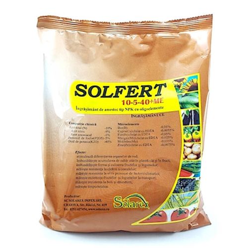 Solfert 10-5-40+ME este un ingrasamant de amestec tip NPK cu oligoelemente, solid, complet solubil in apa, compus din elemente accesibile 100% plantelor de cultura. SOLFERT 10-5-40+ME este un îngrăşământ de amestec tip NPK cu oligoelemente, solid, în totalitate solubil în apă, compus din elemente accesibile 100 % plantelor de cultură Efecte: • Stimuleazã diferenţierea organelor de rod; • Îmbunătăţeşte acumularea de zahăr atât în plantă cât şi în fruct; • Îmbunătăţeşte forma şi culoarea fructelor şi legumelor; • Măreşte rezistenţa la cădere a cerealelor; • Măreşte rezistenţa la stres provocat de factorii climatici; • Măreşte rezistenţa fructelor şi legumelor la transport; • Măreşte rezistenţa la boli şi dăunători; • Măreşte timpurietatea. Recomandări, aplicare: Se poate aplica atât prin fertigare cât şi prin stropire foliară. Prezenţa microelementelor esenţiale sub formă de chelaţi (cu EDTA) asigură o eficienţă foarte bună chiar şi în condiţiile folosirii unei ape dure. Compatibilitate: Produsul SOLFERT 10-5-40 + ME este compatibil cu majoritatea pesticidelor. Pentru o mai mare siguranţă, se va consulta lista de compatibilităţi şi se va face un test.